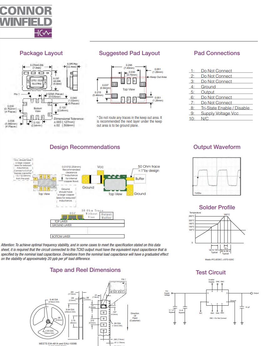4. 謹(jǐn)慎選擇C1、C2的容值。盡量按照廠家提供的推薦值設(shè)計。在滿足起振要求的前提下,C1、C2的取值可以盡量小,能縮短貼片晶振起振時間。ConnorWinfield Crystal,D75J型號晶振,進(jìn)口晶振