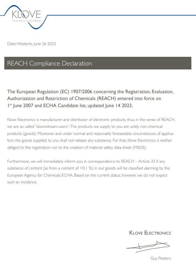 Klove Electronics是電子產(chǎn)品的制造商和經(jīng)銷商,因此,在REACH的意義上,我們被稱為“下游用戶”。我們向您提供的產(chǎn)品僅為非化工產(chǎn)品(商品)。此外,在正常和可合理預(yù)見的應(yīng)用環(huán)境下,提供給貴方的貨物不應(yīng)釋放任何物質(zhì)。為此,Klove Electronics既沒有義務(wù)進(jìn)行注冊(cè),也沒有義務(wù)創(chuàng)建材料安全數(shù)據(jù)表(MSDS)。