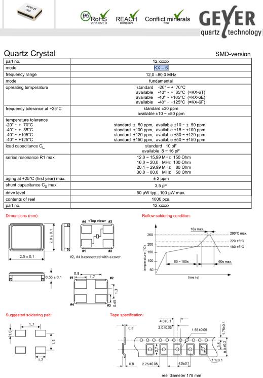 GEYER進口晶振,KX-6藍牙耳機晶振,SMD無源晶振,小型貼片石英晶振,外觀尺寸具有薄型表面貼片型石英晶體振蕩器,特別適用于有小型化要求的市場領域,比如智能手機,無線藍牙,平板電腦等電子數碼產品.晶振本身超小型,薄型,重量輕,晶體具有優(yōu)良的耐環(huán)境特性,如耐熱性,耐沖擊性,在辦公自動化,家電相關電器領域及Bluetooth,WirelessLAN等短距離無線通信領域可發(fā)揮優(yōu)良的電氣特性,滿足無鉛焊接的回流溫度曲線要求.