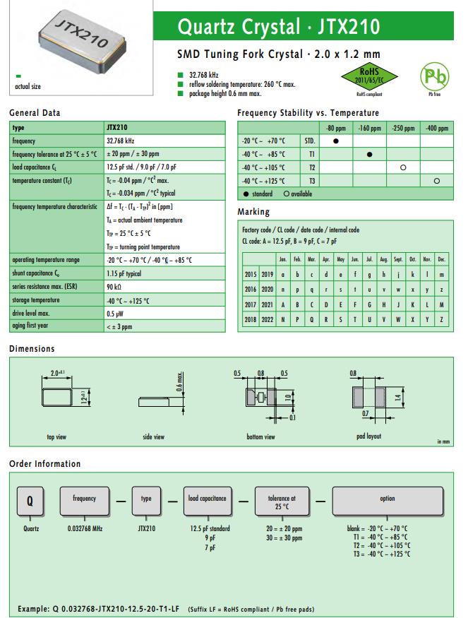 | Q 0.032768-JTX210-12.5-20-T3-LF | JTX210 | 32.768kHz | ±20ppm | 12.5pF |