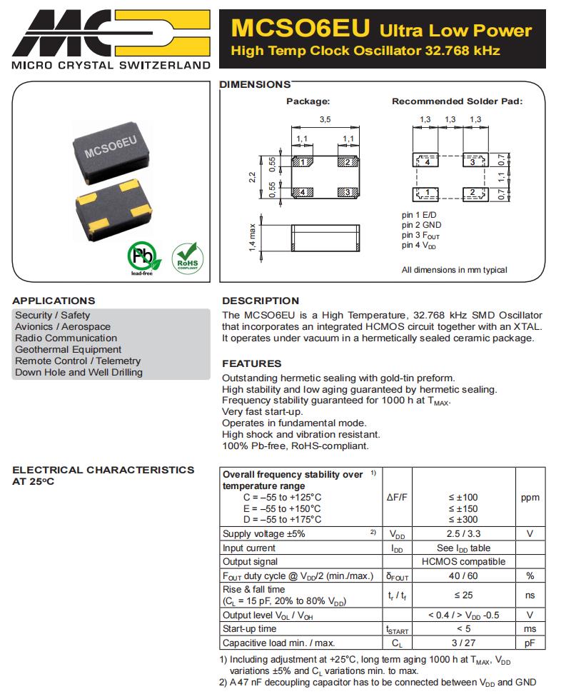 MCSO6EUV-E-32.768kHz-E/D-T3|32.768KHz有源晶振|6G發(fā)射器晶振,Micro晶振,MCSO6EU進口晶振,MCSO6EUV-E-32.768kHz-E/D-T3晶振,3522mm晶振,有源晶振,頻率32.768KHz,電壓3.3V,頻率穩(wěn)定性100ppm,工作溫度-55~150°C,耐高溫晶振,低老化晶振,6G發(fā)射器晶振,無線電通信晶振,安保應用晶振,地熱設備晶振,井下和鉆井應用晶振.