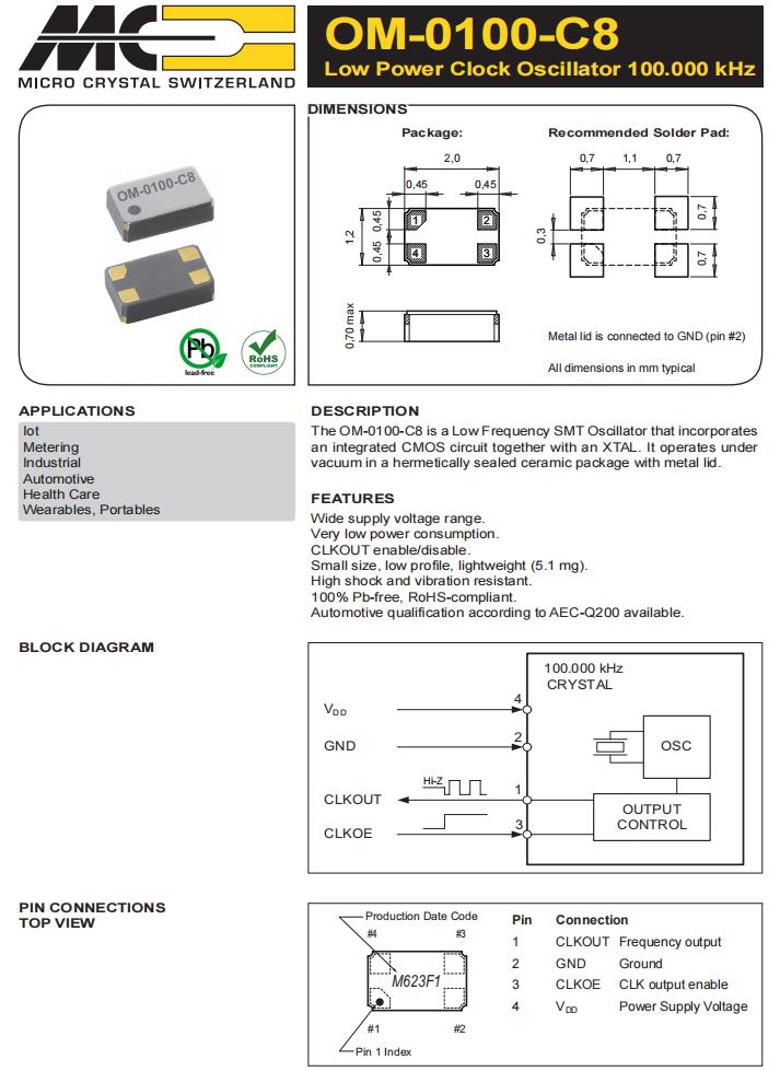 | OV-0100-C7-100.000kHz-50PPM-TA-QC | Micro Crystal | 標準時鐘振蕩器 100.0 kHz +/-50 PPM -40/+85C |