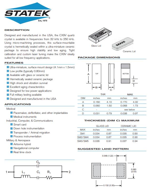 STATEK晶振將水晶放置玻璃封裝以及陶瓷蓋封裝內(nèi),人造水晶相較于其他使用機(jī)械生產(chǎn)的水晶要小的多.所生產(chǎn)水晶元件具有領(lǐng)先優(yōu)勢(shì),具有以下特點(diǎn):高穩(wěn)定性,頻率精準(zhǔn),保存溫度范圍廣,抗老化性能強(qiáng)等特點(diǎn).Statek石英晶振,晶體振蕩器具有小型化,低功耗,優(yōu)秀的耐沖擊性,抗氧化性佳等特點(diǎn).廣泛使用于全球GPS定位系統(tǒng),WLAN網(wǎng)絡(luò)產(chǎn)品,網(wǎng)絡(luò)控制器,無(wú)線基站,程控交換設(shè)備,精密儀器,GPS衛(wèi)星,汽車應(yīng)用,計(jì)算機(jī),全球GPS定位系統(tǒng),無(wú)線通訊,數(shù)碼產(chǎn)品等等.