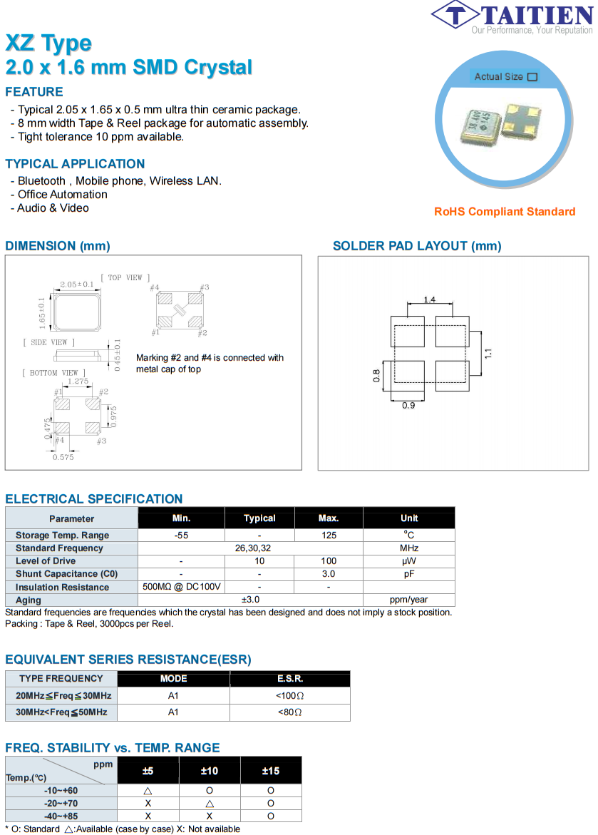 | XZAEECNANF-26.000000 | Taitien | XZ | 26MHz | ±30ppm | ±30ppm | 8pF |